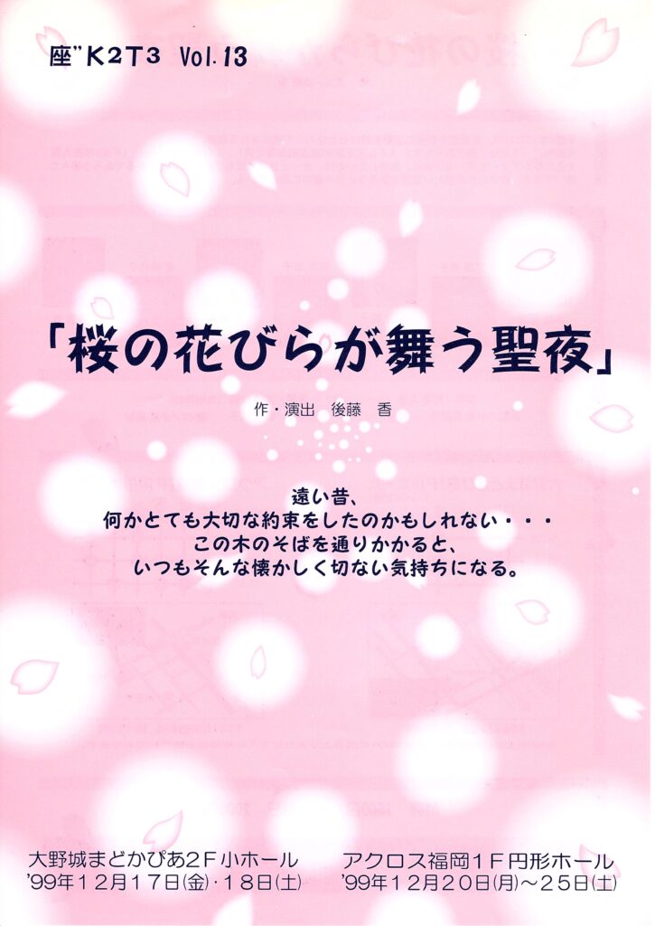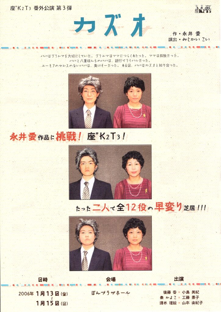 最初のSS公演は青年センターでやった三浦さん脚本の『アーリー・マイ・ラブ』でした。これは後年ロングランでも上演した作品。SSはショートショートだかショートストーリーだかの略だったような…。番外編ではオリジナルだけじゃなくて既存の戯曲もやってます。永井愛さんの『カズオ』とか。