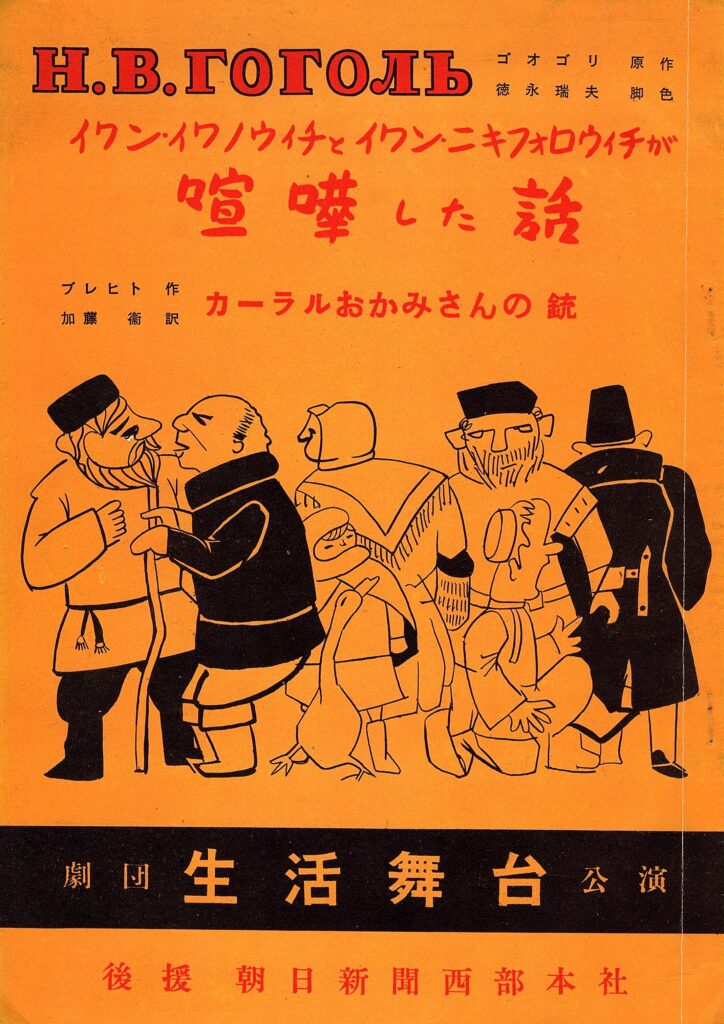 ただ劇団が本公演を行ったのは創立から1年半も後のことだ*8。ようやく上演した本公演『イワン・イワノヴィッチとイワン・ニキフォロヴィチが喧嘩した話』(ゴーゴリ作、徳永瑞夫脚色・演出)『カラールのおかみさんの銃』(ブレヒト作、加藤衛訳、天本一雄演出)*9のパンフレットに徳永は以下のように書いている。「現在の生活舞台は、運動に重点をおき創造の場での責任を多く負担しない『サークル』から、あるいは趣味的な『サロン』からようやく離脱した。」*10。数本の研究発表会こそしているが「本公演」までに1年半もかかったのは、徳永の望む域に達するまでそれだけの時間が必要だったということか。