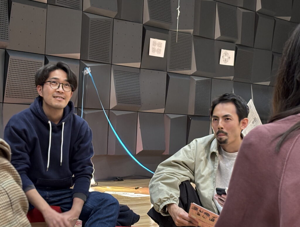 テツ:僕も空間がすごく印象的だったですね。いろんな音があって、いろんな所から声が聞こえて来て、その飛んでくる音と空間で色々見えている…光も…音もいろんな楽器の鳴らし方があって水の音とか…そこに込められている思いを読み取るというよりは全体の空間に自分がその中にいるという感じがしました。