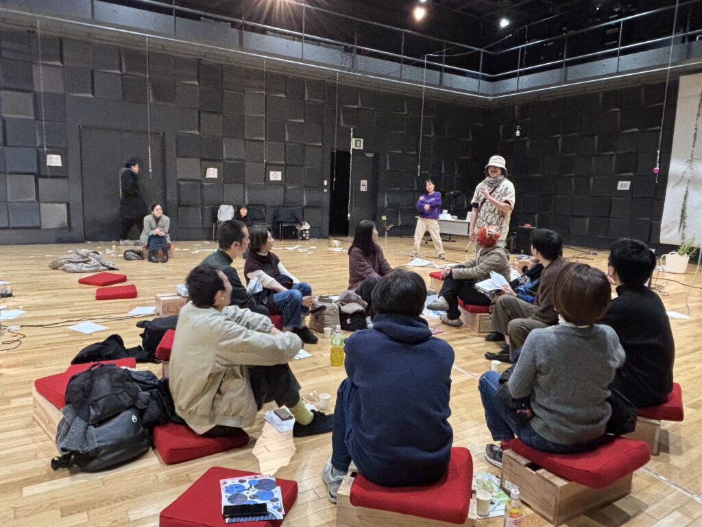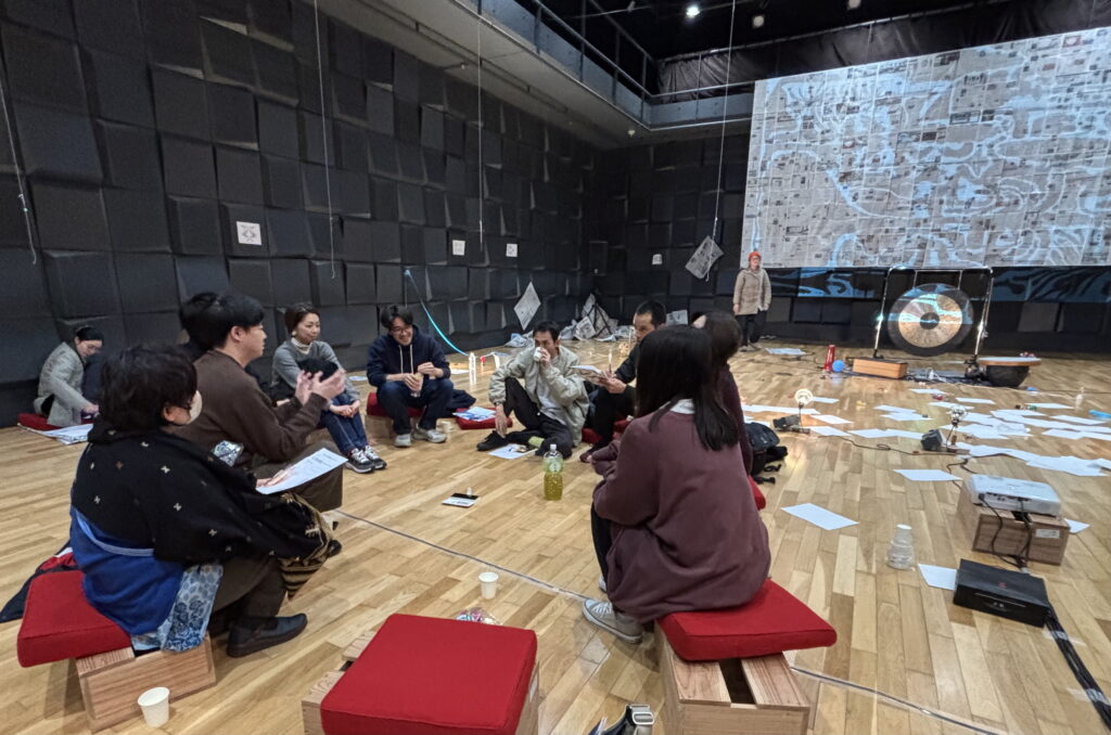 りょう:そうですね。舞台に表があって閉ざされたじゃないけど…もっと視野がギュッと狭まってる…感覚もたぶん音とか光とかもどこで何が起こるか分からないから常に開いてないといけないし。見ないという選択肢も。全部追おうとしても無理じゃないですか。だから諦め…じゃないけど、その感じは広場にいる感覚に近いのかなと。何となく気配は感じるし喋っているのは分かるし、喋っているのがこの場では主役的な感覚で聞いているけどでもあえて目では追わないというか。