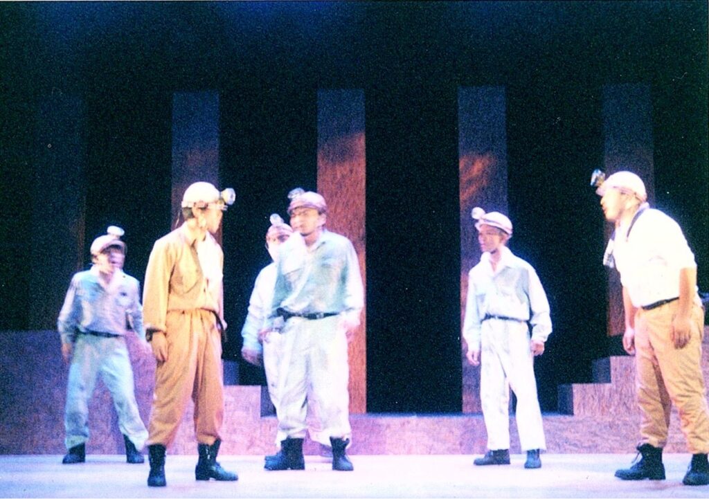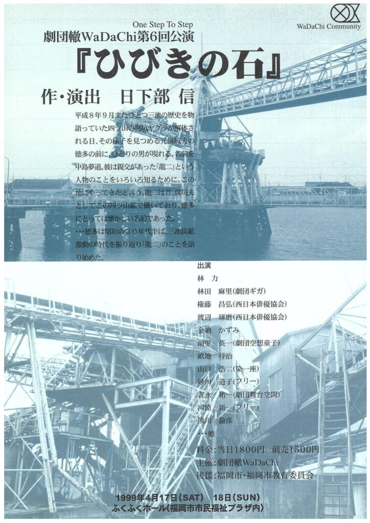 書きながらいよいよネタも尽き、また東京にも行かないし、福岡市を拠点にしてるって一体何なんだろうなって過渡期を迎え、それが98年ごろ。じゃぁもう泥臭くても自分が本当に書きたいものを徹底して探そうという動きになりました。見渡したら北の方には筑豊の炭鉱があり、南には大牟田・荒尾の三池炭鉱があり。でも筑豊はボタ山だなぁと思って、三池はボタ山ないな、と疑問に。全然違った性格の炭鉱で、近くに海があるないも関係していた。これ面白いなと思って半年かけて調べるところからやって、僕自身、まだまだ物語に飢えていたというか、筑豊は個々の炭鉱でいろいろあり、三池炭鉱は大きな争議や事故もあったんで、これはすごいなと思って。なりふり構わず三池炭鉱を舞台にしてみようと思いました。また当時、不思議なご縁で井上ひさしさんの戯曲にも出会っているし、マキノノゾミさんの劇団(劇団M.O.P.)に客演で出られることが出来て。マキノさんからもアドバイスをたくさんもらいました。そして第6回公演として『ひびきの石』をふくふくホール(福岡市市民福祉プラザ内)で上演したら、劇団の流れが変わったというか、一気に…例えば西日本新聞の経済部の記者さんが取材に来たり、大牟田でもやってくれと言われたり。ここらあたりで「自分探しからの脱却」みたいなのができたのかなぁ、28歳でしたね。