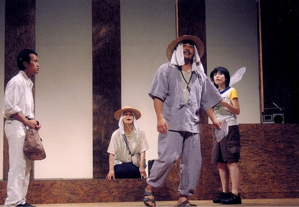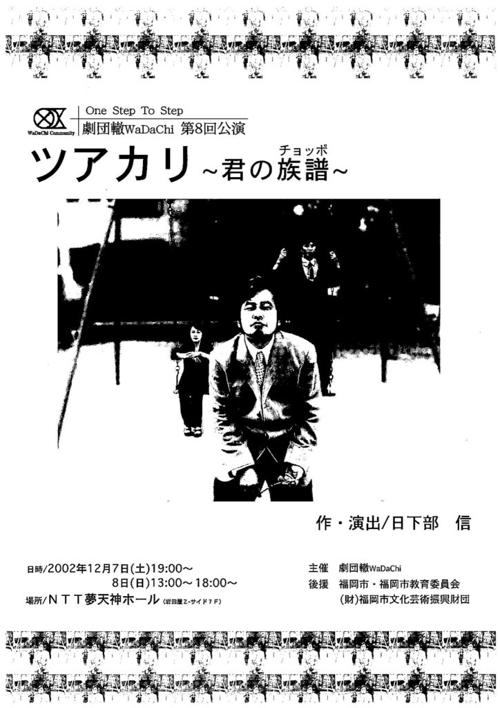 日下部:ギンギラ(太陽’S)ともコラボさせていただいたことがありました。大塚ムネトさんはとても上の先輩演劇人ですが、すごく気が合って。実は2002年に合同公演と銘打って、劇団ごと一緒に芝居づくりさせてもらいましたねー。(『福岡電話物語』『オムレット』)。そして同じ年に、在日コリアン2世3世の方々を取材して創った第8回公演『ツアカリ~君の族譜(チョッポ)~』で、劇団のカラーがはっきりしたんじゃないかなと思います。この時期、ひとつの作品に時間をたくさん使って作っていました。
