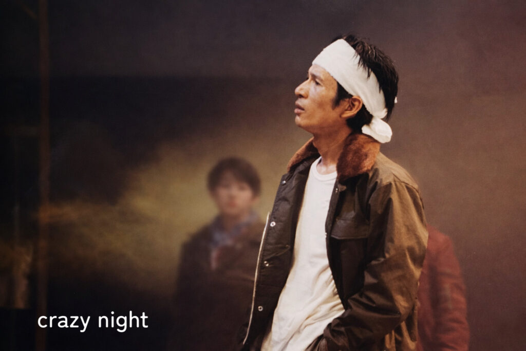 大石:福岡では芝居をほとんど見ていなかったのですが、旗揚げ公演の後に当時パワーサプライの荒巻くんプロデュースのイムズ芝居にちょい役で出させていただいた時にいろんな劇団の方に会いました。みんな個性的で面白かったですね。荒巻くんは今でもたまにパワフルサラダの忘年会に来てくれて当時の話なんかもします。あと、役者としては浦辻純子さんが主宰してた「ユヤユヨン」の麻倉さんがすごく良くて、何かのきっかけで意気投合して『Crazy Night』に客演してもらいました。ロックンロールっていう一言だけの台詞(笑)。でも存在感はさすがでした。そのうち二人でマーティン・シャーマンの『BENT』やろうって盛り上がってましたね。客演といえば「芝居小屋」の大山隆光さんも上手い役者さんで2回客演していただきました。